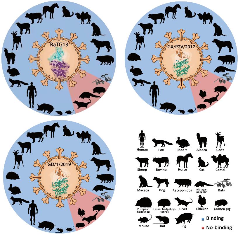 中国科学院微生物研究所高福院士团队建立了高效评估冠状病毒跨种识别能力的方法,利用这些方法对蝙蝠源性冠状病毒 RaTG13和穿山甲源性冠状病毒 GD/1/2019 和 GX/P2V/2017 的跨种传播潜在风险进行评估,并阐明其跨种识别的分子机制,研究发现上述三种冠状病毒存在跨种传播的潜在风险,提示我们要持续对动物源性冠状病毒进行监测,预防新的冠状病毒引发疫情,同时为理解病毒进化提供分子基础。
